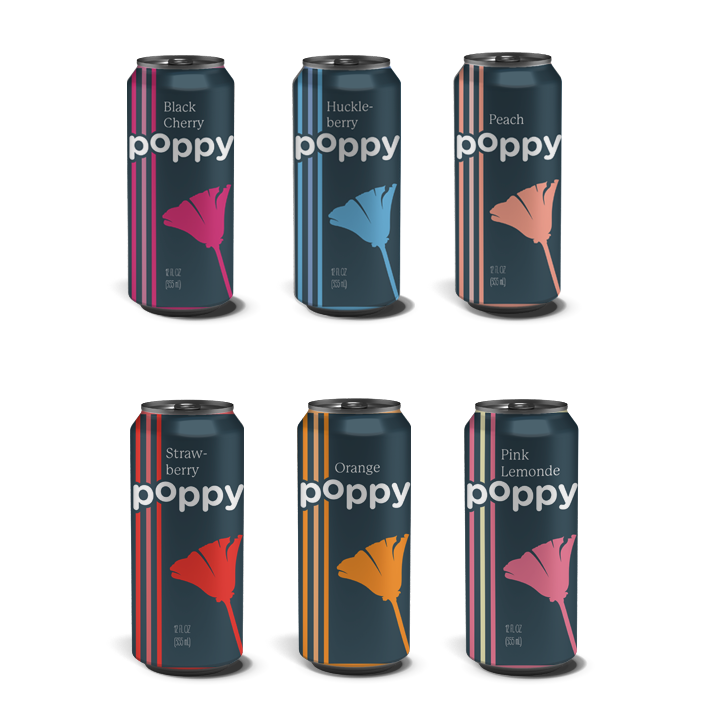 A soda can packaging system exploring brand language, color, and form consistency across a multi-flavor lineup.