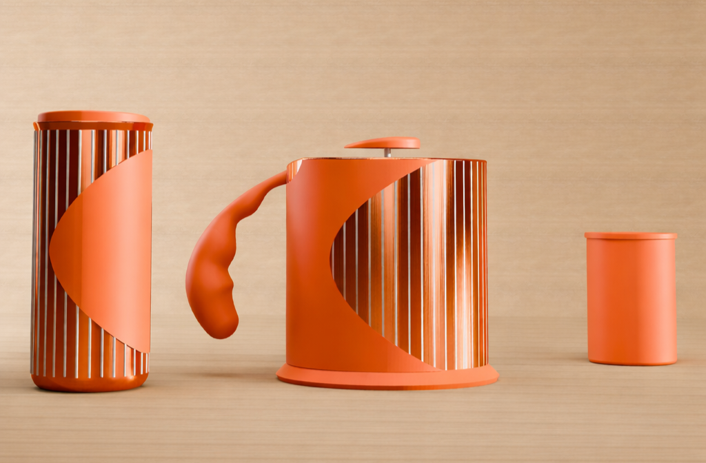 The result is a sleek & retro-futuristic 3 part coffee set. The swooping forms are not only beautiful, but functional, utilized as grip and insulation to keep the user safe. Accents inform the user how to hold each piece, making for a highly intuitive concept.