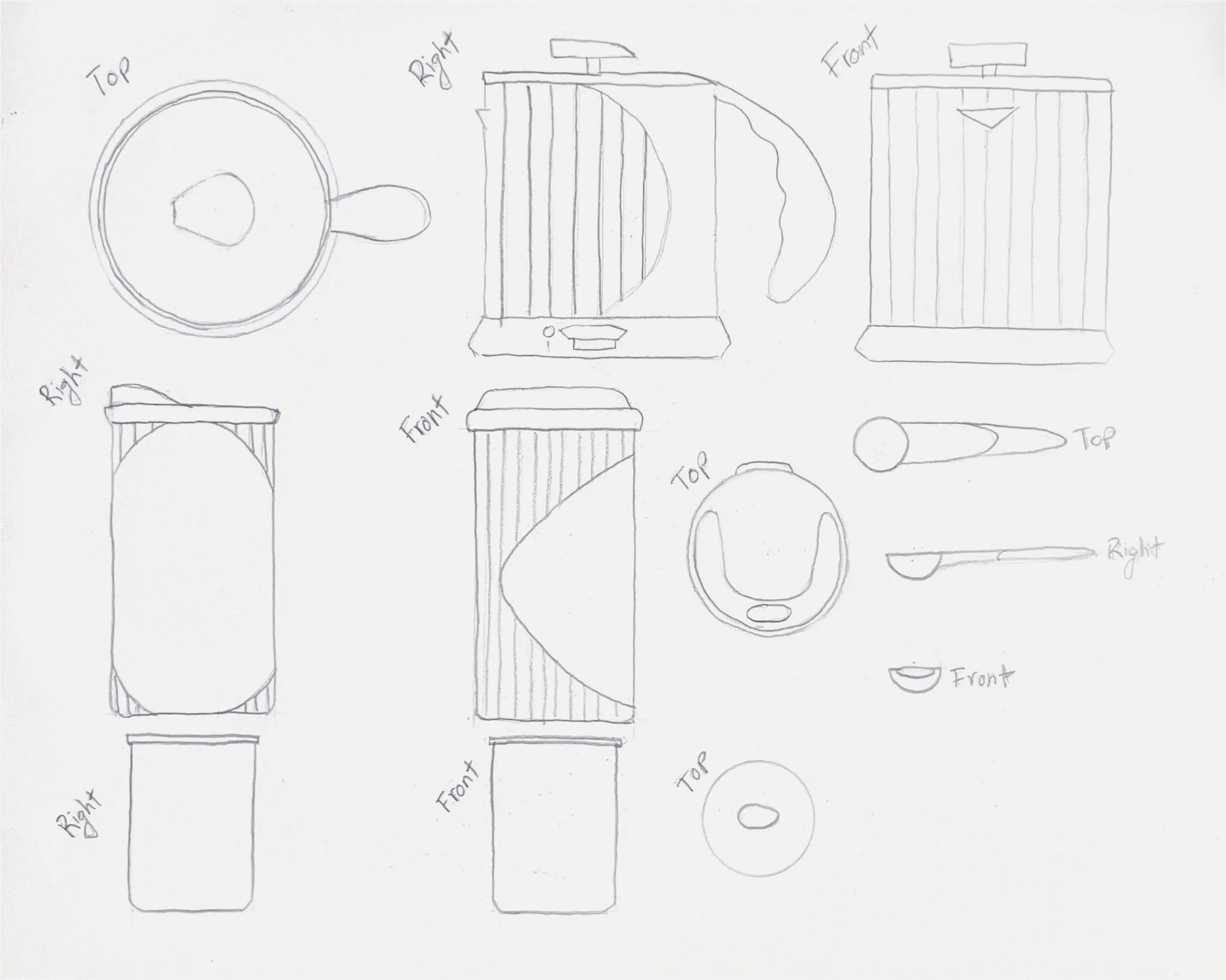 Whittled down ideation to a sketch showing 4 parts, electric kettle, a travel mug, a milk frothing cup, and a measuring spoon.