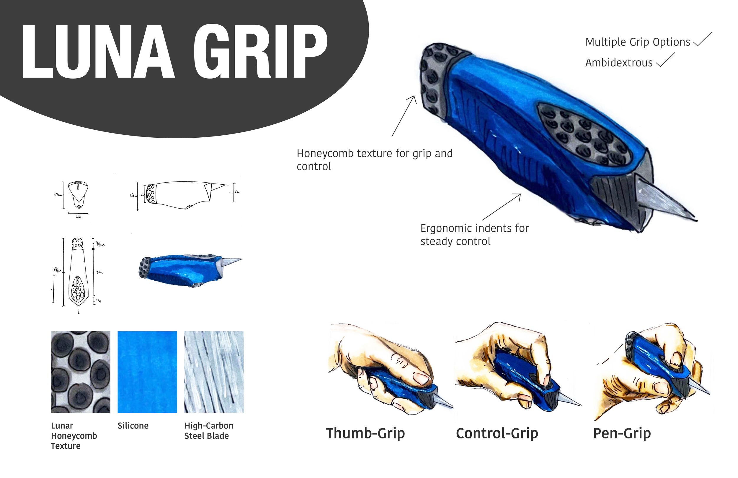 An ergonomic cutting tool designed through hand studies, grip analysis, and iterative sketching to improve comfort, control, and safety during prolonged use.