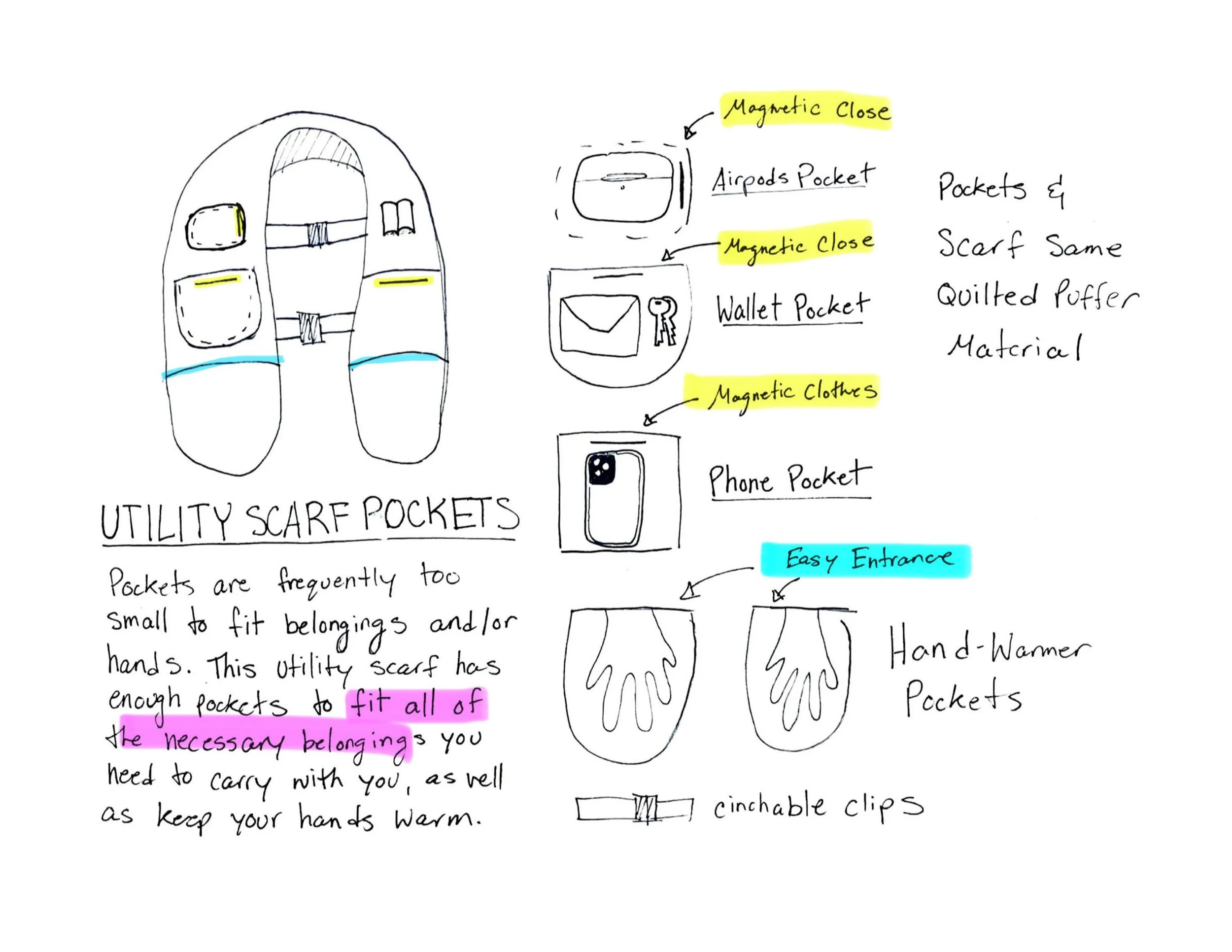 Create an ergonomic pocket system that puts the user first, allowing them to carry their essential belongings and keep their hands warm without compromising the garment’s form.